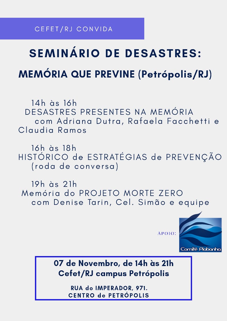 O Seminário de Desastres é uma ação extensionista planejada pelo projeto do Cefet/RJ campus Petrópolis “No Batuque das Águas do Caxambu: práticas para a Coesão Social”, coordenado por Patrícia Souza Lima, professora de história e representante do campus Petrópolis no Comitê Piabanha.
