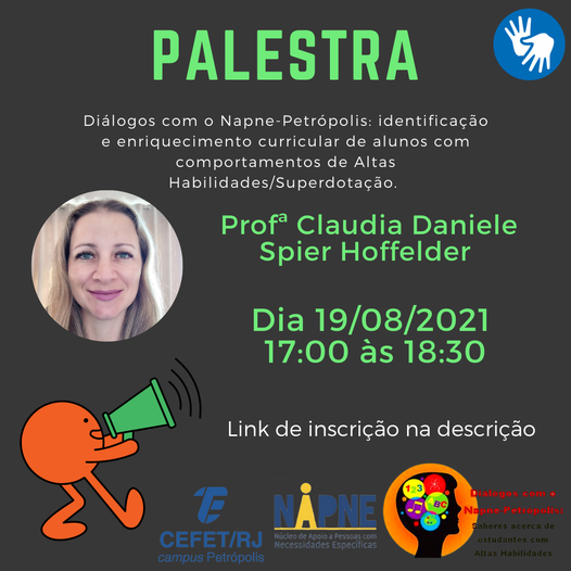 O projeto de extensão Diálogos com o Napne Petrópolis: saberes acerca de estudantes com altas habilidades, do Cefet/RJ campus Petrópolis, vai realizar na próxima quinta-feira, dia 19 de agosto, a palestra “Identificação e enriquecimento curricular de alunos com comportamentos de altas habilidades/superdotação”. O evento on-line acontecerá das 17h às 18h30 por meio da ferramenta Microsoft Teams.