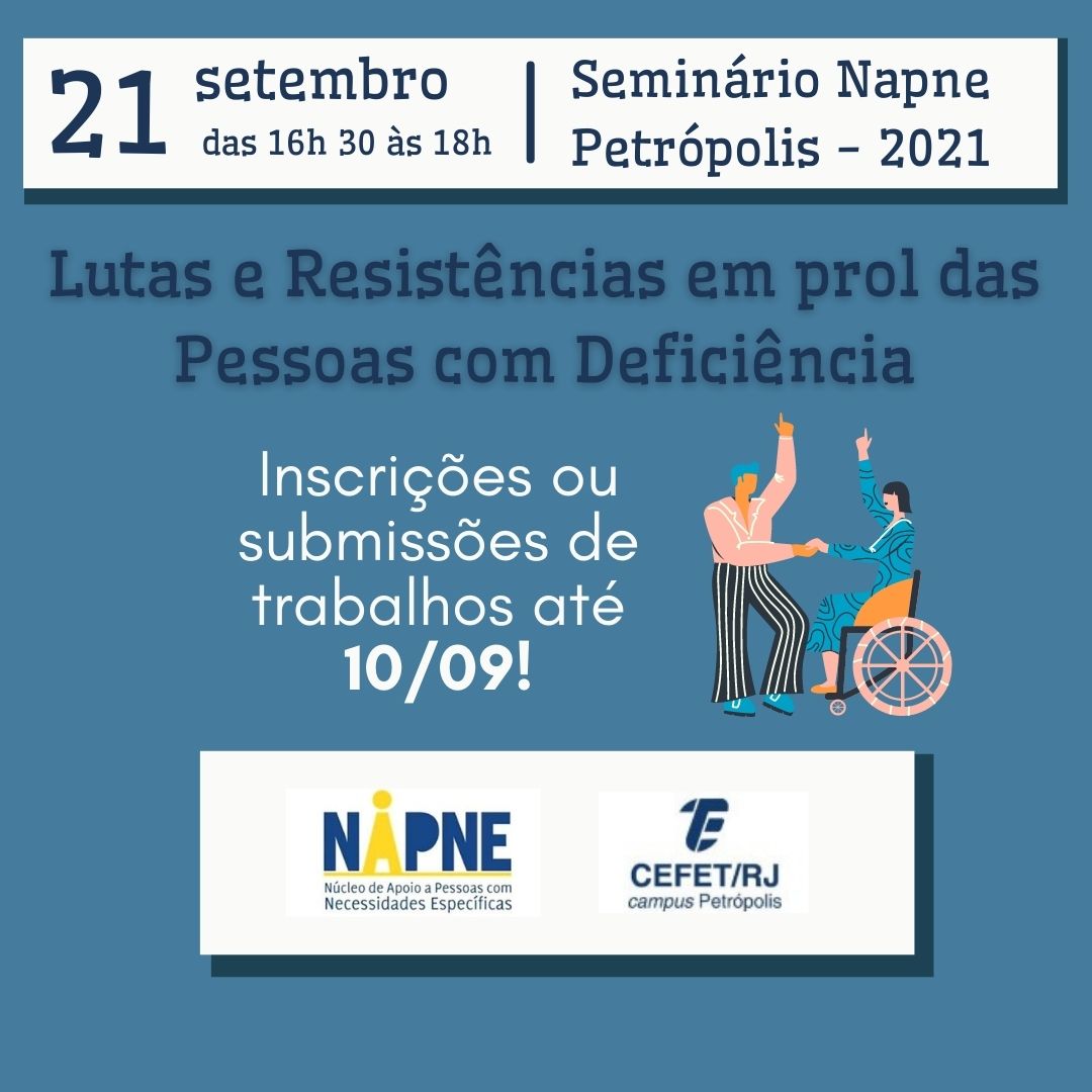 Em comemoração ao Dia Nacional de Luta das Pessoas com Deficiência, que é celebrado em 21 de setembro, o Núcleo de Apoio a Pessoas com Necessidades Específicas (Napne) do Cefet/RJ campus Petrópolis promoverá o seminário “Lutas e Resistências em prol das Pessoas com Deficiências". O evento on-line – que acontecerá pela plataforma Microsoft Teams no próprio dia 21, das 16h30 às 18h – está com o prazo de submissões de trabalhos e de inscrições aberto até o dia 10 de setembro.