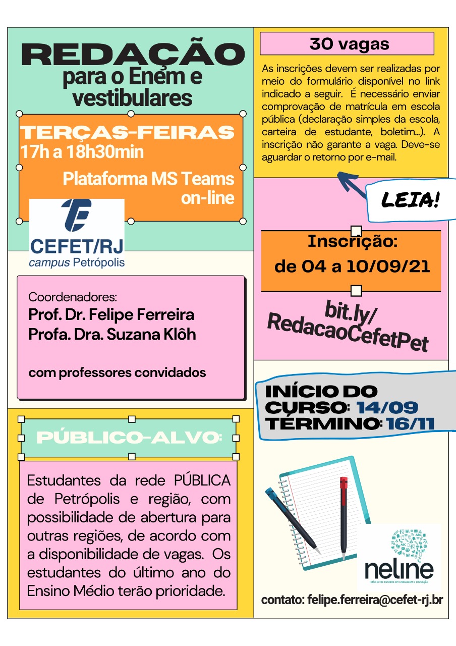 Inscrições: até 10/09 pelo link bit.ly/RedacaoCefetPet
