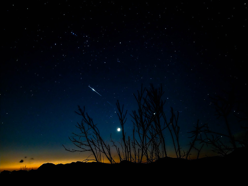 Nesta foto, Marcos Emanuel registra um satélite passando, a constelação de Orion logo acima, a lua nova (principal ponto brilhante) e o planeta Vênus (o segundo ponto brilhante à direita da lua).