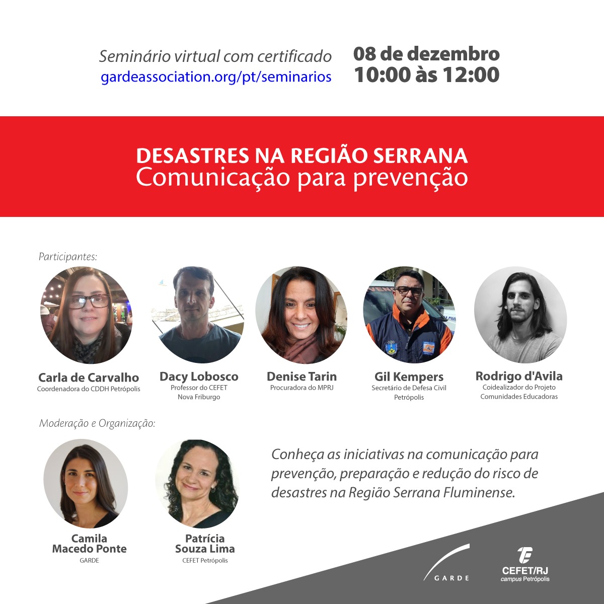 Na próxima quarta-feira, dia 8 de dezembro, de 10h às 12h, o Cefet/RJ Petrópolis – por meio de seu projeto de extensão No Batuque das Águas do Caxambu – e a Associação Global para Resiliência, Redução de Riscos de Desastres e Meio Ambiente (Garde) promovem o Seminário “Desastres na Região Serrana: comunicação para prevenção”. O evento será gratuito e on-line pela plataforma Microsoft Teams.