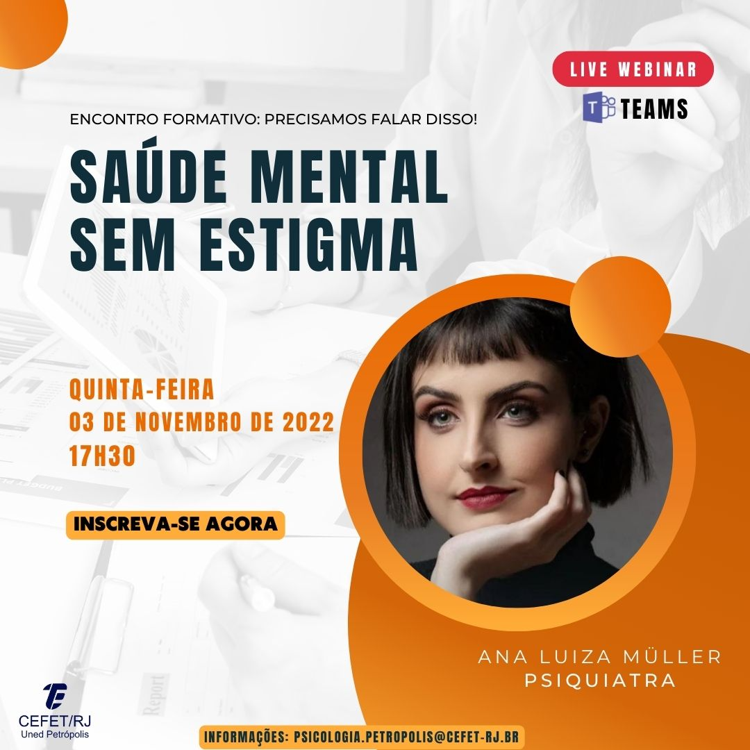 Com o objetivo de criar espaços para discutir temas relacionados à saúde mental, o setor de Psicologia do Cefet/RJ Petrópolis dará início a série “Encontros Formativos: precisamos falar disso!”. A iniciativa realizará a primeiro encontro no dia 3 de novembro (quinta-feira), às 17h30, via Microsoft Teams. O evento, que terá como tema “Saúde mental sem estigma”, será conduzido pela psiquiatra Ana Luiza Muller.