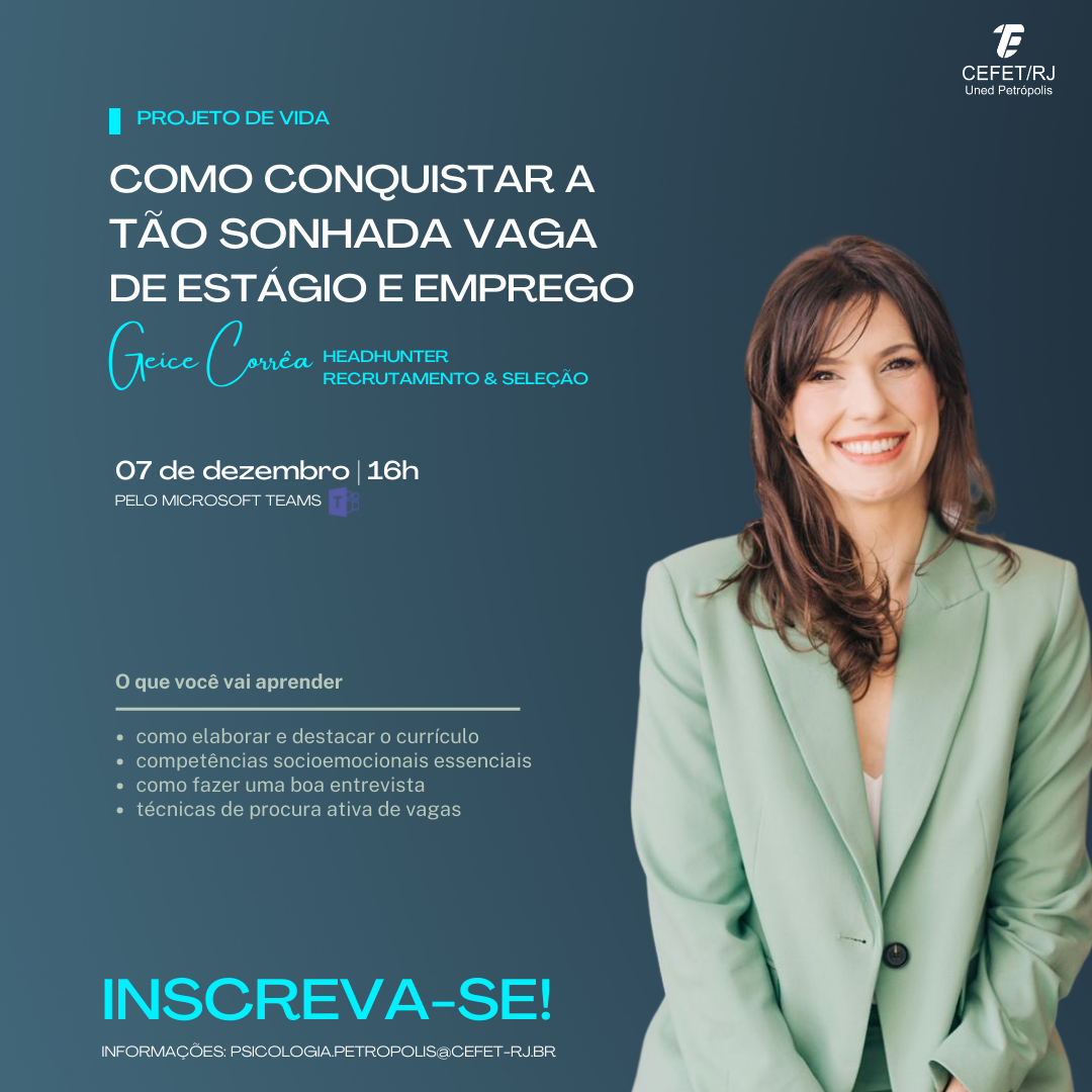 “Como conquistar a tão sonhada vaga de estágio e emprego” é o tema da palestra on-line que será realizada no dia 7 de dezembro (quarta-feira), às 16h, pela plataforma Microsoft Teams. A atividade, que será conduzida pela headhunter Geice Cristina Côrrea, faz parte da série “Projeto de vida: trajetórias, formação pessoal e profissional”, organizada pelo Serviço de Psicologia do Cefet/RJ Petrópolis.