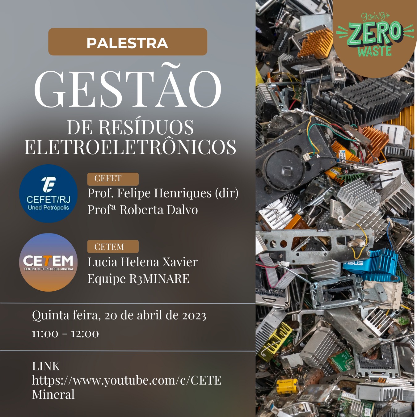 Na palestra, Cefet/RJ Uned Petrópolis e Cetem abordarão a proposta de cooperação entre as instituições e o lançamento do curso de capacitação continuada para a formação de agentes multiplicadores para a gestão de REEE - Resíduos de Equipamentos Eletro-Eletrônicos.
