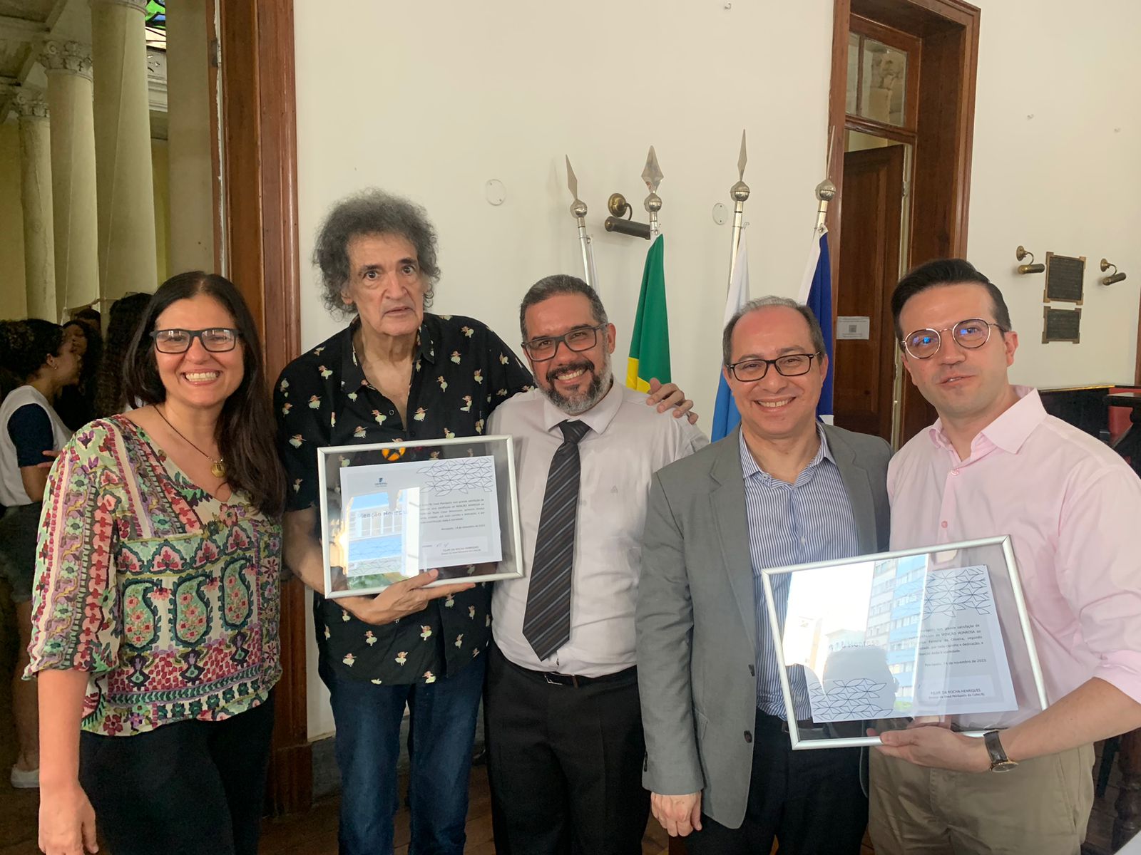 Os homenageados Paulo Bittencourt (à esq.) e Frederico Oliveira (à dir) ao lado da vice-diretora Gisele Vieira, do diretor da Uned Petrópolis Felipe Henriques e do diretor-geral Mauricio Motta