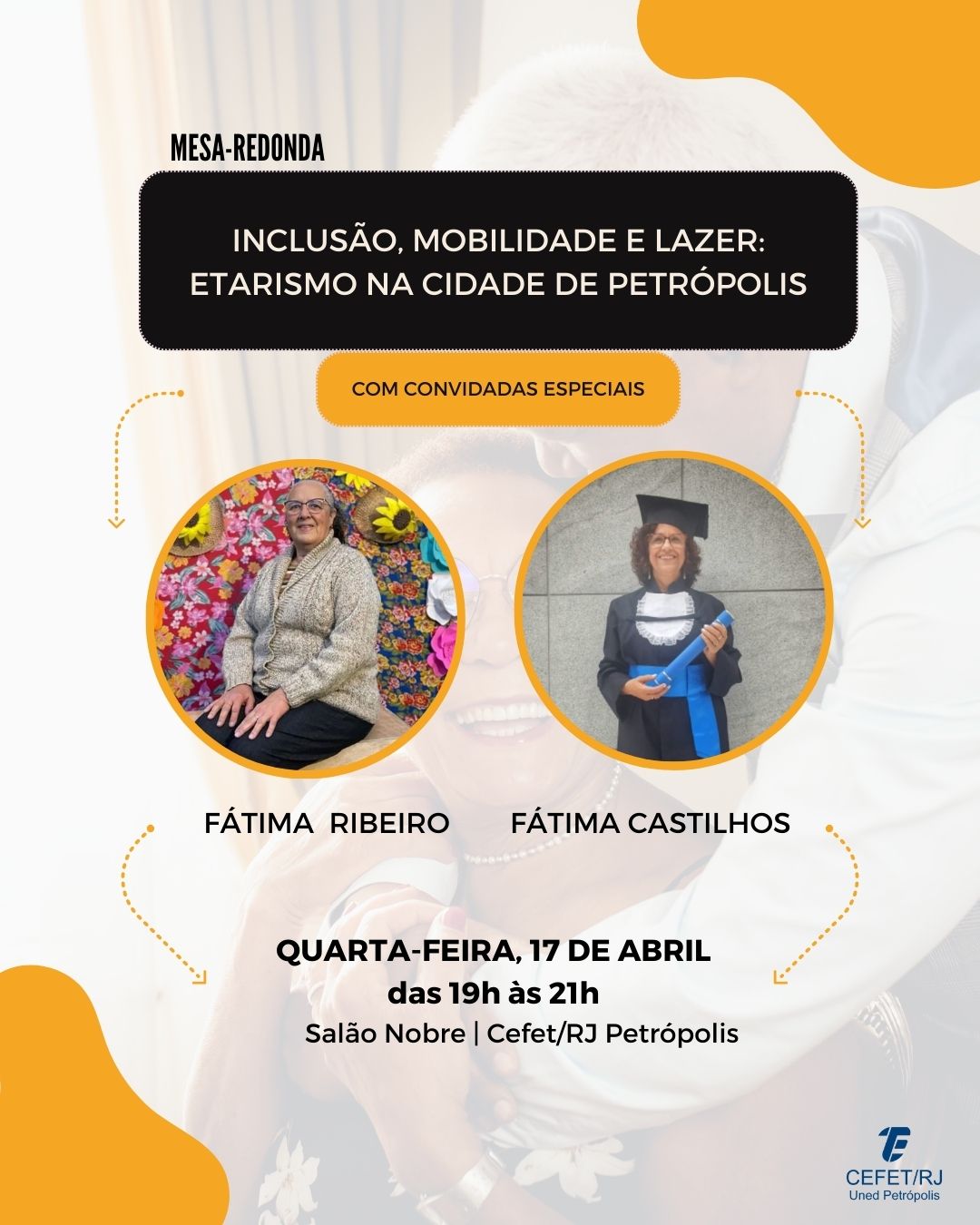 Na quarta-feira, dia 17 de abril, a turma da disciplina de Geografia Urbana do curso de Bacharelado em Turismo do Cefet/RJ Petrópolis, da professora Aixa Melo, irá promover a mesa-redonda “Inclusão, mobilidade e lazer: etarismo na cidade de Petrópolis”. O evento – que conta com o apoio do projeto Espaço Urbano e Afetividade: Inclusão da terceira idade na cidade e da Comissão Permanente para a Promoção da Cultura de Paz – será realizado no Salão Nobre a partir das 19h.