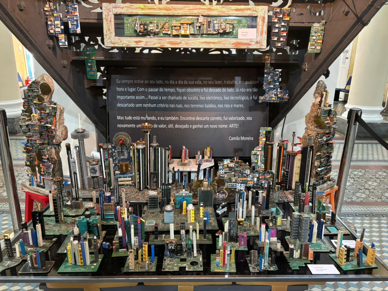 “Eu quis mostrar que, além de transformar o lixo em arte, as pessoas podem gerar renda com isso”, declarou Camilo Moreira. O artista plástico contou que a exposição traz o nome de um projeto antigo seu de reaproveitamento de insumos e de mostras itinerantes em escolas. Camilo abraça em seu trabalho a sustentabilidade, usando uma técnica própria para reaproveitar os materiais de forma eficiente e criteriosa. Ele reforça a importância de saber trabalhar com alguns resíduos, que podem contaminar o solo, por exemplo.