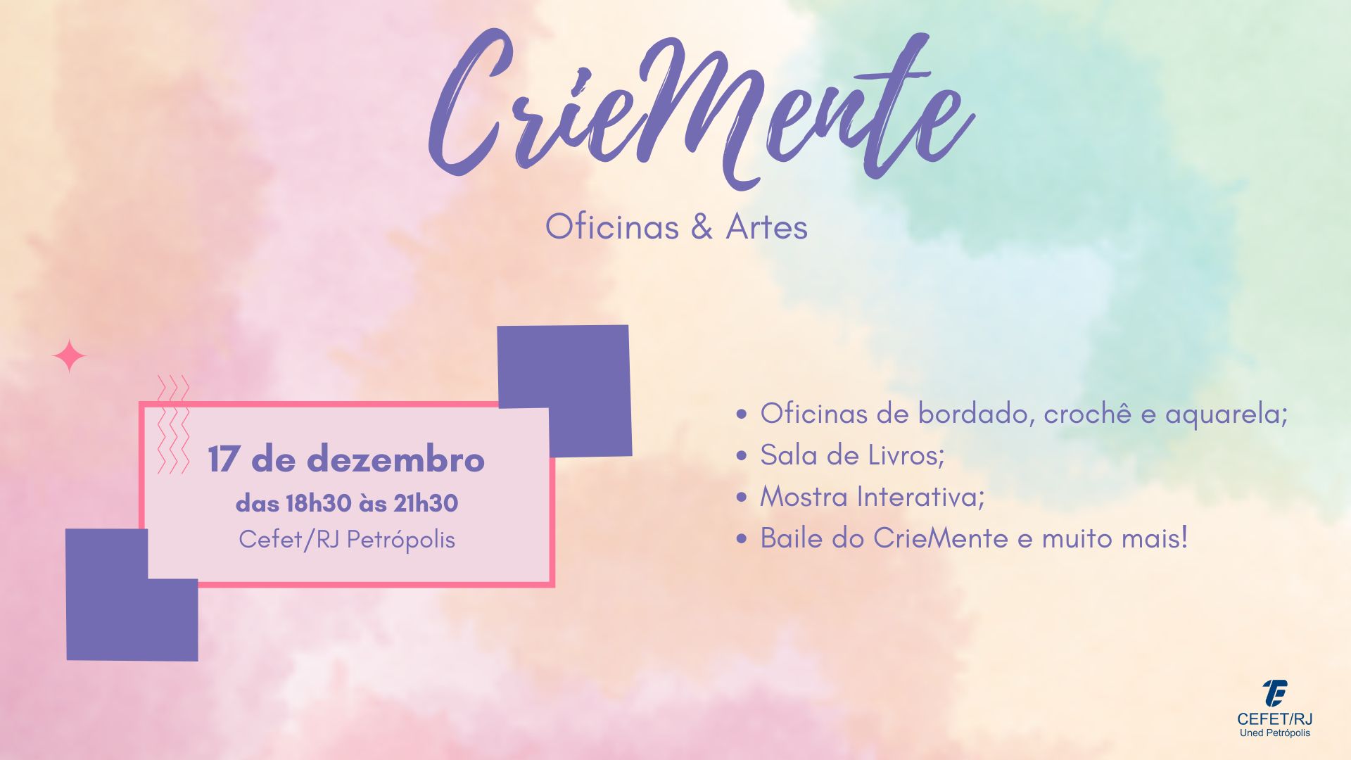 A turma de Gestão de Eventos e Produção Cultural do curso de Bacharelado em Turismo do Cefet/RJ Petrópolis está organizando o projeto CrieMente, que acontecerá no dia 17 de dezembro, das 18h30 às 21h30.