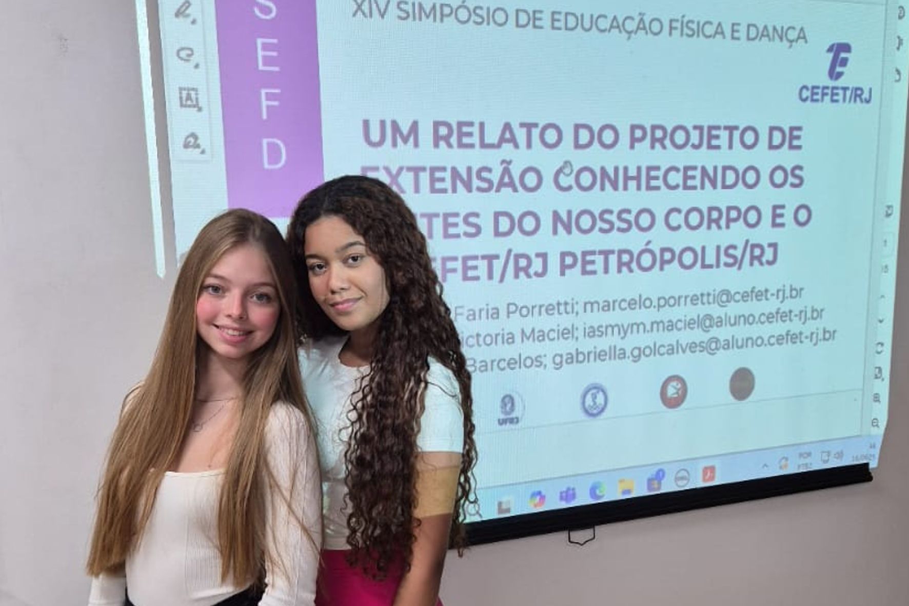 As estudantes Iasmym Maciel e Gabriella Barcellos, do 3º ano do ensino médio integrado ao técnico em Telecomunicações do Cefet/RJ Petrópolis, apresentaram um trabalho no XIV Simpósio de Educação Física e Dança da UFRJ na segunda-feira, dia 16 de junho.