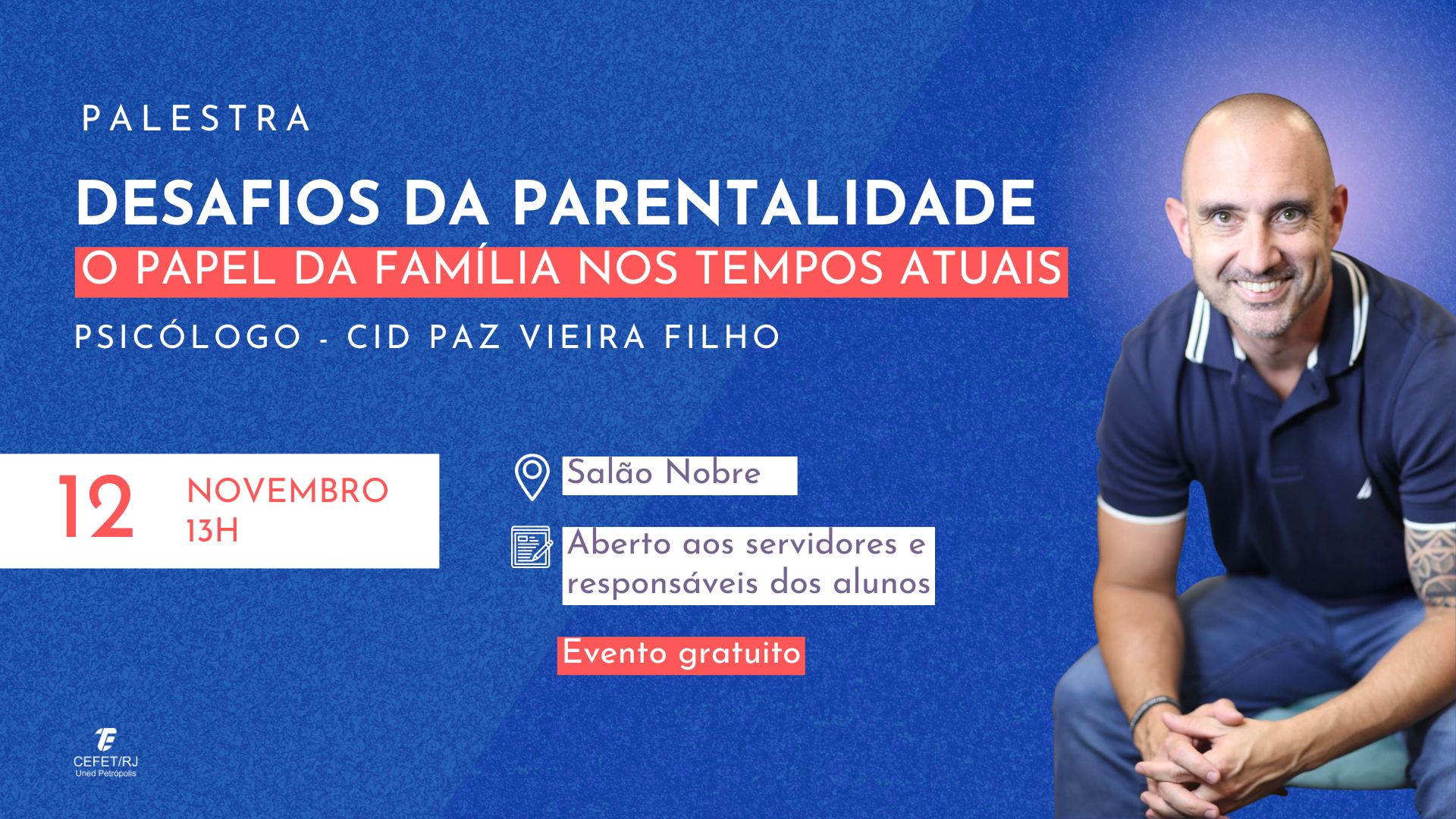 O Cefet/RJ Petrópolis promove no dia 12 de novembro a palestra “Desafios da Parentalidade: o papel da família nos tempos atuais”, com o psicólogo Cid Paz Vieira Filho. O encontro, que acontecerá às 13h no Salão Nobre, é voltado para servidores e responsáveis de alunos.