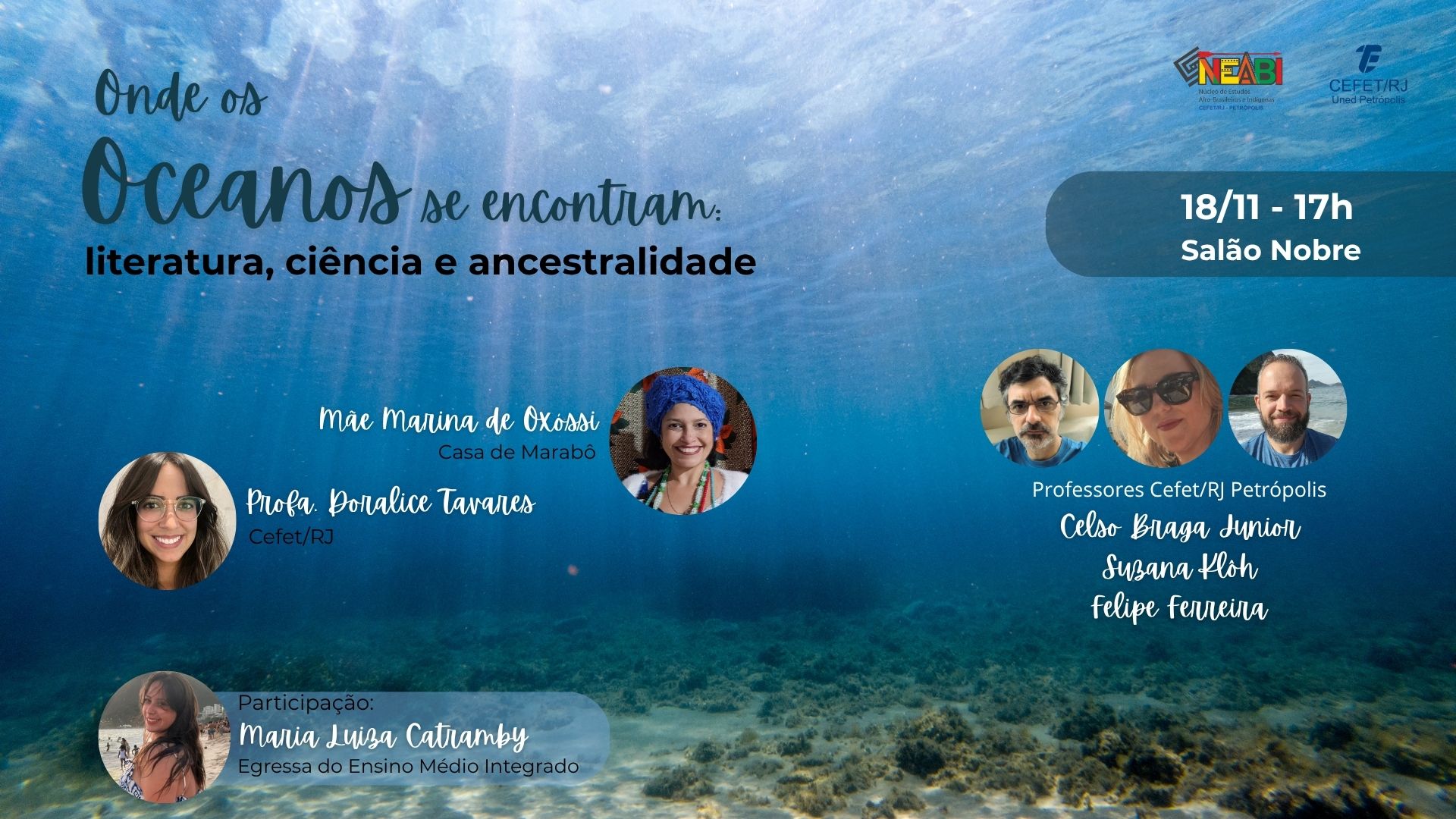 Participarão da mesa-redonda: a mãe pequena da Casa de Marabô, Mãe Marina de Oxóssi; a engenheira ambiental e professora do Cefet/RJ Doralice Chagas Tavares; os docentes do Cefet/RJ Petrópolis Celso Braga Júnior (Sociologia), Suzana Klôh (Letras) e Felipe Ferreira (Letras); e a aluna egressa do ensino médio integrado da unidade Maria Luiza Catramby.