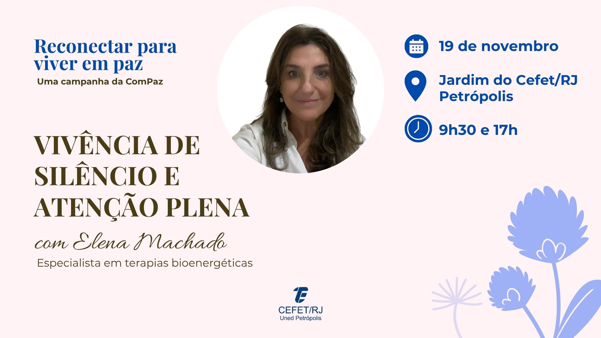 Buscando trabalhar o bem-estar e promover a cultura de paz, a vivência será conduzida pela especialista em terapias bioenergéticas, Elena Machado. Durante a atividade, os participantes serão guiados por práticas de respiração consciente, meditação guiada, escuta interior e silêncio ativo.