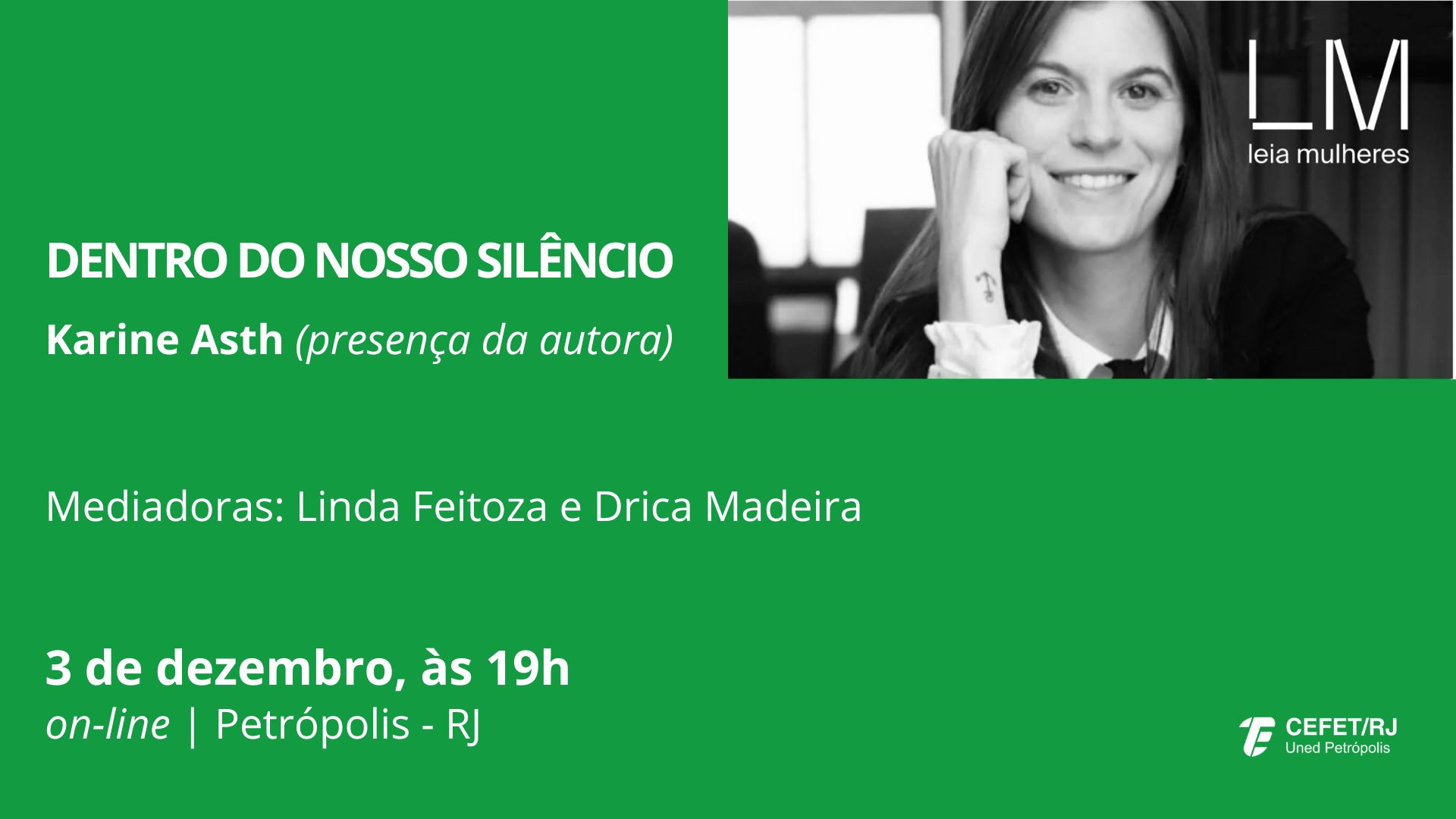 O encontro, que contará com a mediação de Linda Feitoza e Drica Madeira, será on-line no dia 3 de dezembro, a partir das 19h, pelo Google Meet. Os interessados em participar devem solicitar o link do evento por meio das redes sociais – Leia Mulheres Petrópolis no Instagram e  grupo Leia Mulheres Petrópolis-RJ no Facebook
