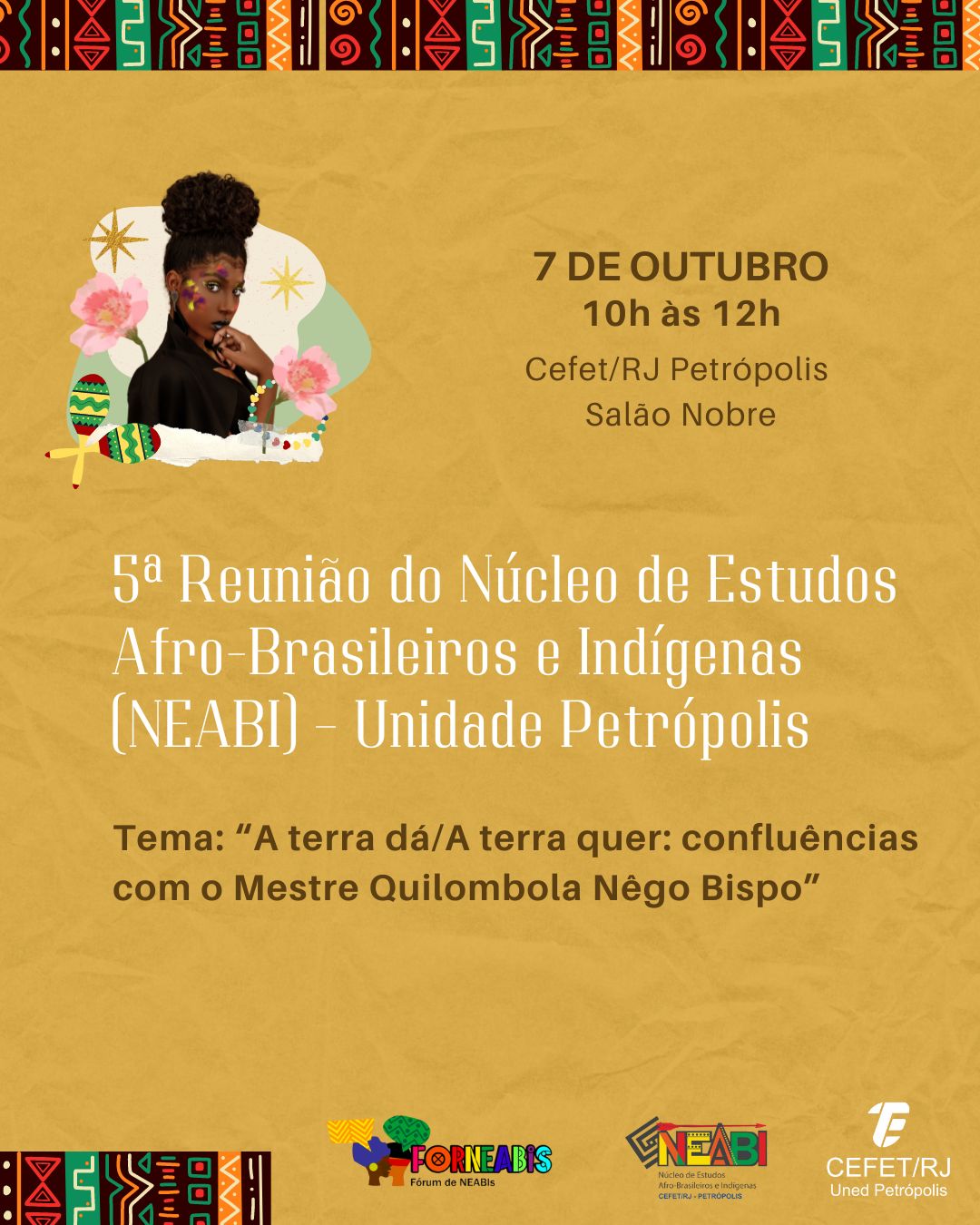 Na próxima segunda-feira, dia 7 de outubro, o Núcleo de Estudos Afro-Brasileiros e Indígenas (Neabi) do Cefet/RJ Petrópolis vai debater "A terra dá/a terra quer: confluências com o...