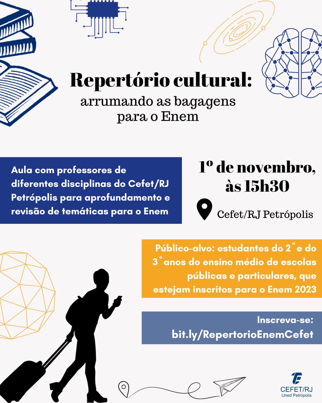 Com a proximidade do Exame Nacional do Ensino Médio (Enem), o Cefet/RJ Petrópolis realizará uma aula aberta para aprofundamento e revisão para a prova no dia 1º de novembro, às 15h30....