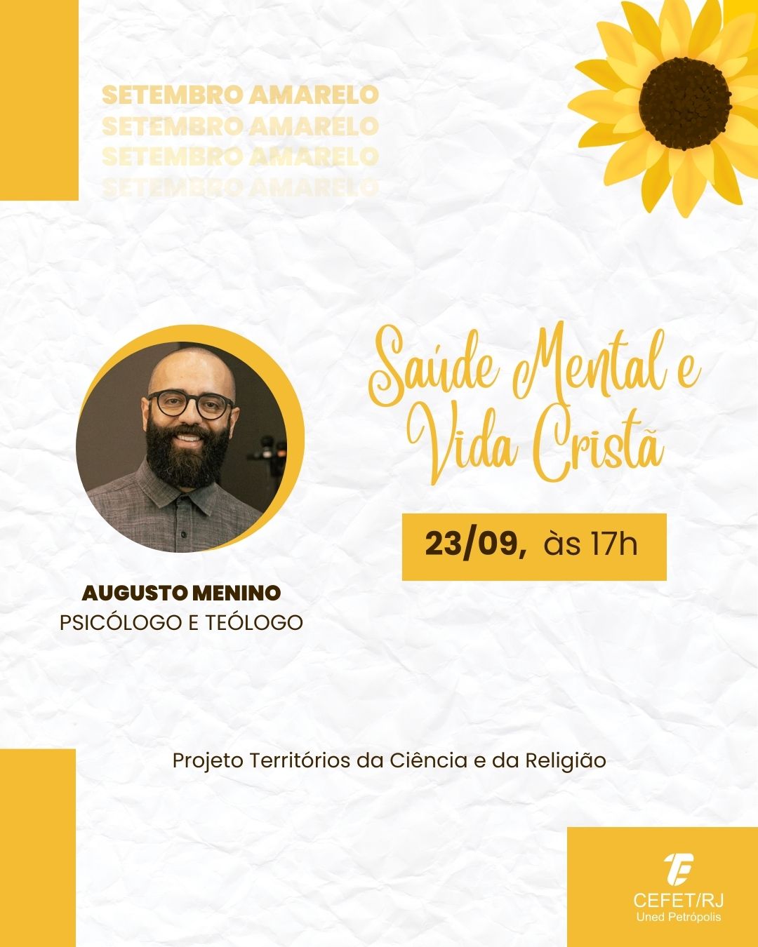 No próximo sábado, dia 23 de setembro, às 17h, o projeto de extensão Territórios da Ciência e da Religião do Cefet/RJ Petrópolis realizará uma palestra presencial sobre saúde...