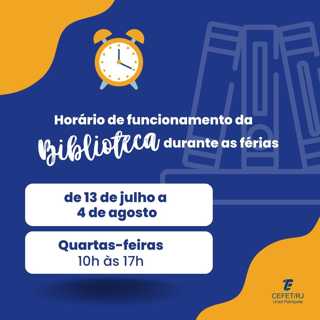Devido ao período de férias acadêmicas, a Biblioteca do Cefet/RJ Uned Petrópolis adotará um novo horário de funcionamento entre os dias 13 de julho e 4 de agosto. O atendimento...