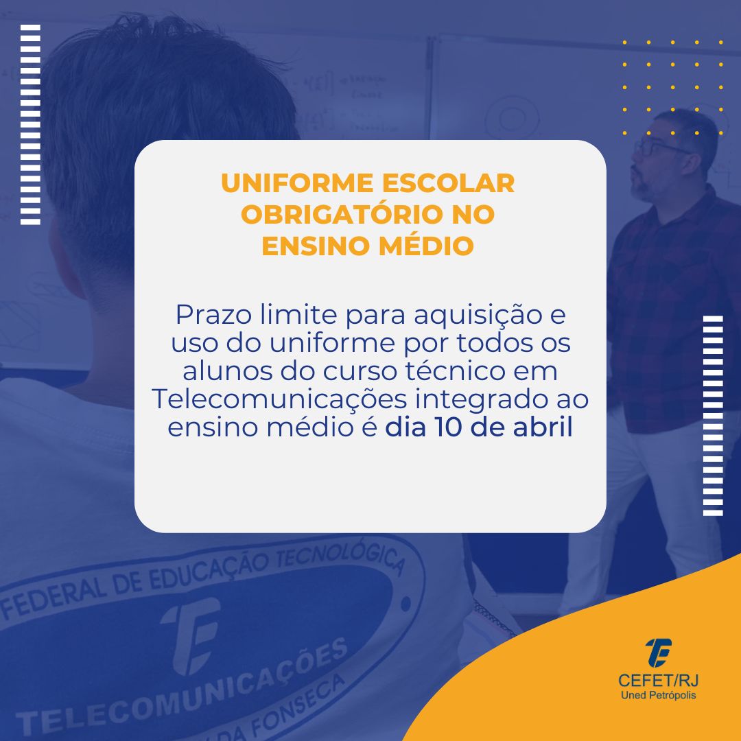 O uso de uniforme escolar pelos alunos do curso técnico em Telecomunicações integrado ao ensino médio é obrigatório dentro das dependências do Cefet/RJ Petrópolis. Sendo também um...