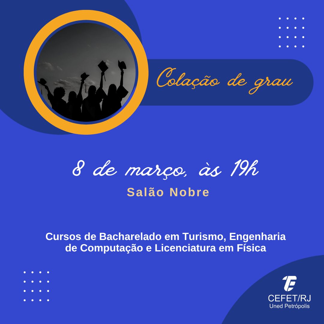 O Cefet/RJ Petrópolis realiza na próxima quarta-feira, dia 8 de março, às 19h, a cerimônia de colação de grau dos alunos concluintes dos cursos de Bacharelado em Turismo, Engenharia...