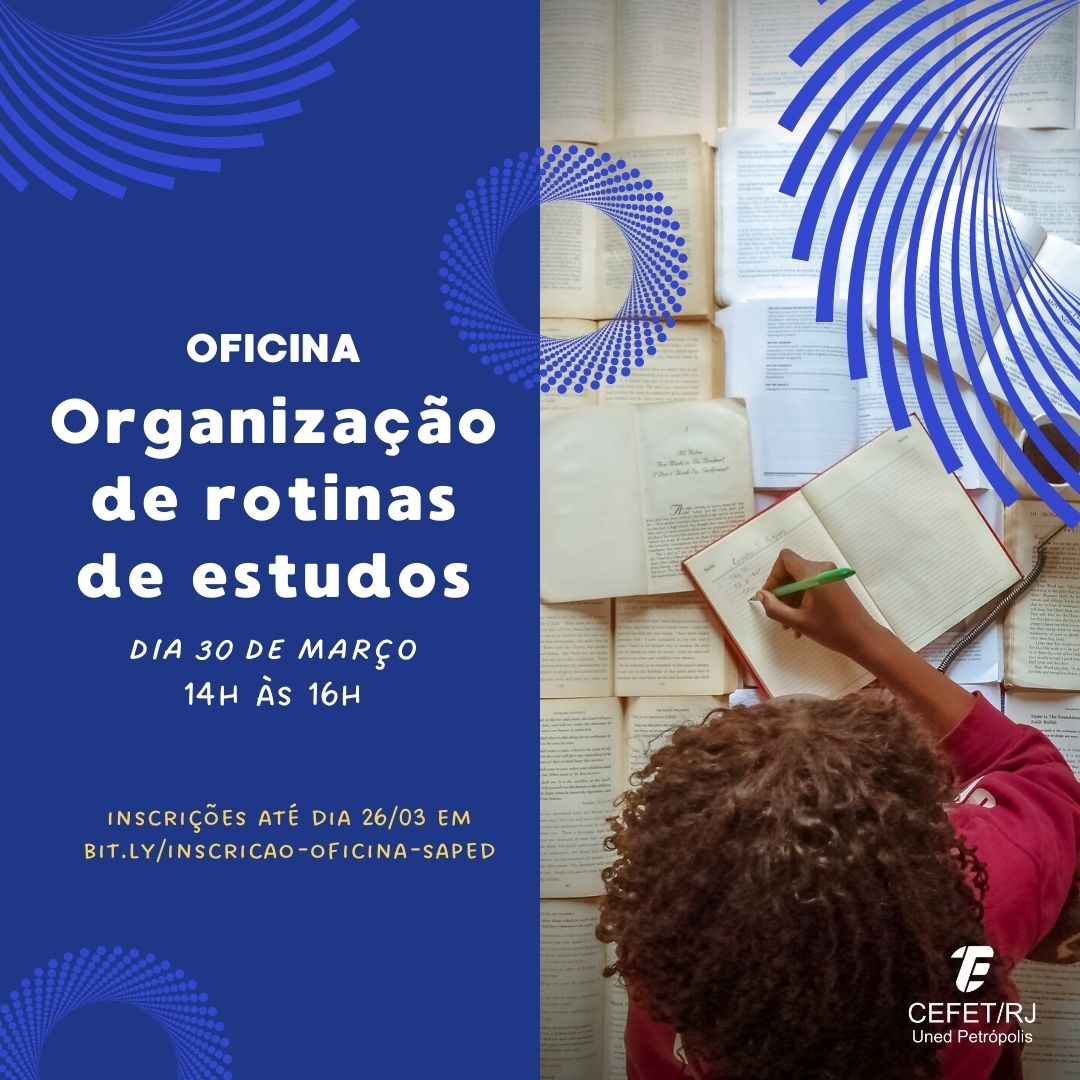 A Seção de Articulação Pedagógica (Saped) do Cefet/RJ Petrópolis vai promover no dia 30 de março (quinta-feira), das 14h às 16h, a oficina “Organização de rotinas de estudos”....