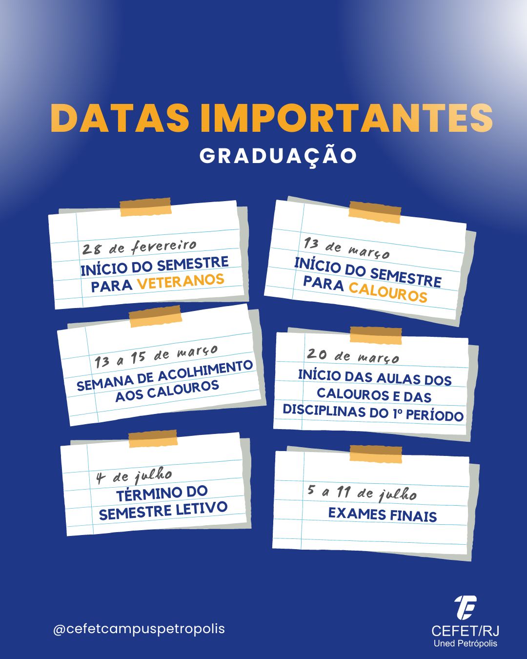 A gerência acadêmica do Cefet/RJ Petrópolis divulgou as datas do início das aulas para os alunos calouros e veteranos dos cursos de graduação neste 1º semestre letivo de 2023. Os...