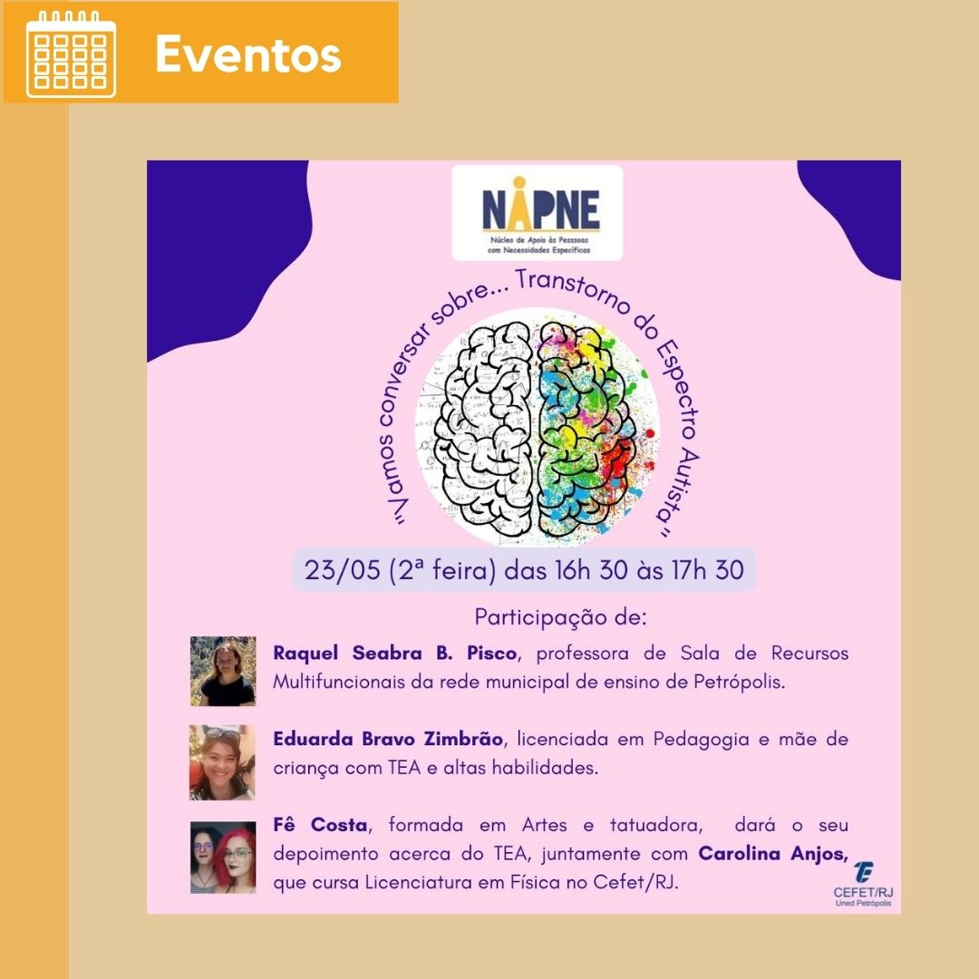 O Núcleo de Apoio às Pessoas com Necessidades Específicas (Napne), do Cefet/RJ Petrópolis, vai realizar o seu primeiro evento do ano – “Vamos conversar sobre... Transtorno do...