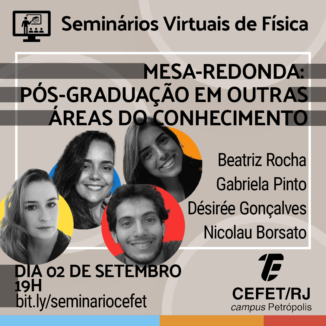 Alunos egressos do curso do Licenciatura em Física do Cefet/RJ campus Petrópolis vão promover no próximo encontro do Seminários Virtuais, no dia 2 de setembro, a “Mesa-redonda:...