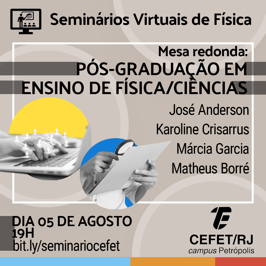 No próximo dia 5 de agosto, o projeto Seminários Virtuais realizará a “Mesa-redonda: pós-graduação em ensino de física/ciências” a partir da visão dos discentes egressos do...