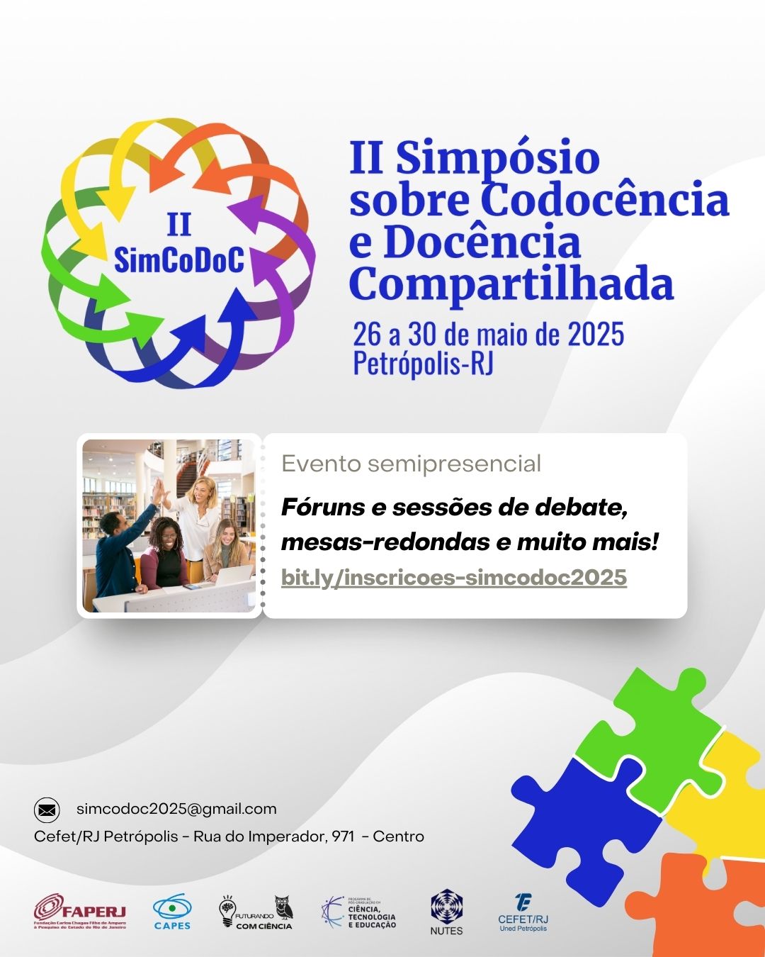 O II Simpósio sobre Codocência e Docência Compartilhada (II SimCoDoC), que acontecerá no Cefet/RJ Petrópolis entre 26 e 30 de maio, está com inscrições abertas até o dia 12 de maio...