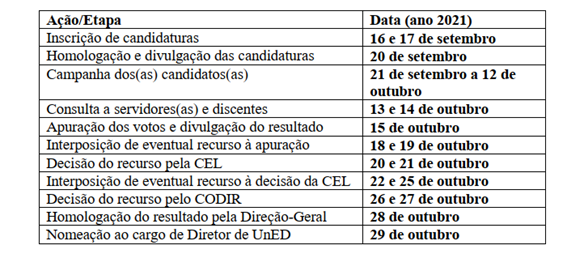 As etapas para a Eleição de Diretor de Uned - 2021 seguirão o calendário abaixo: