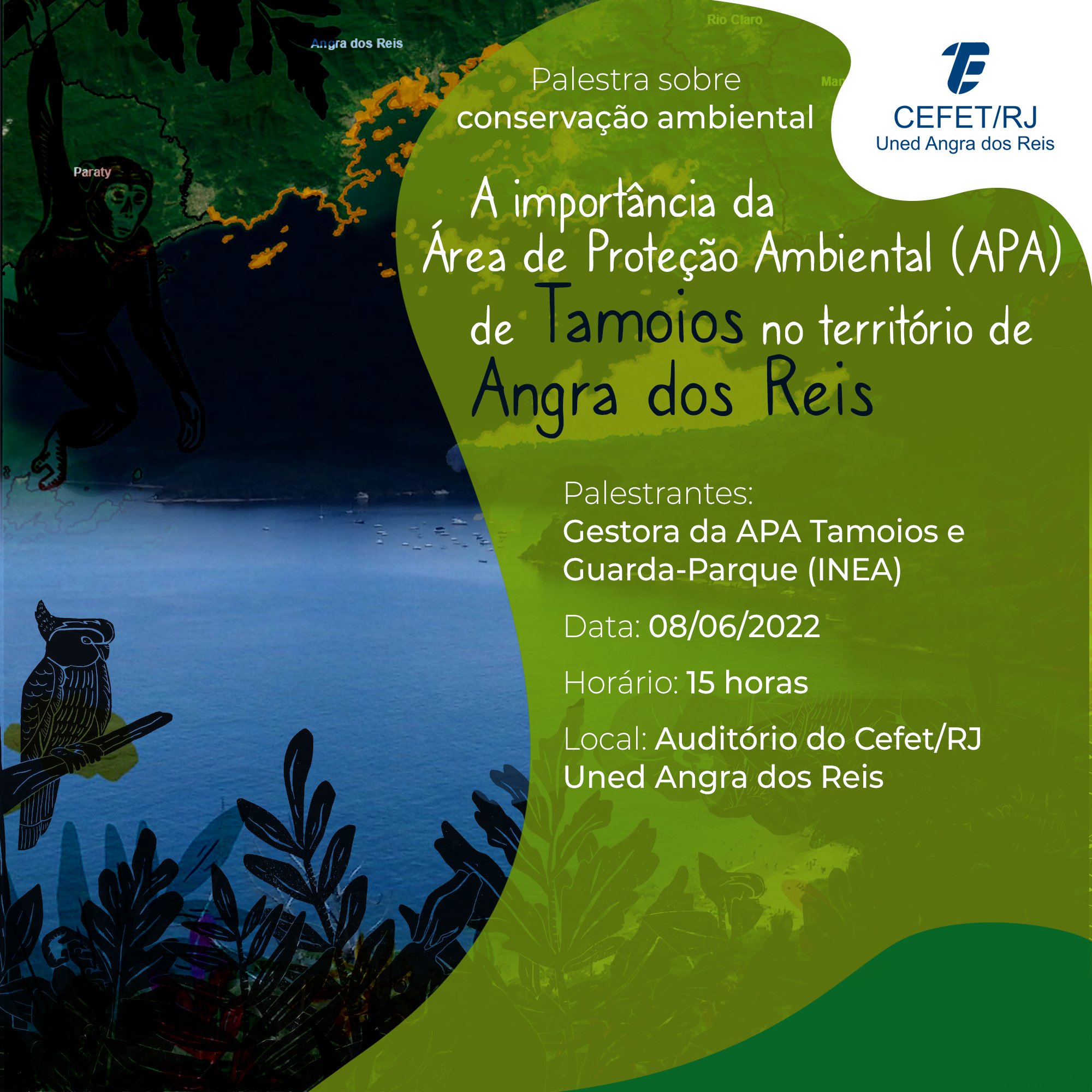 Divulgamos abaixo a palestra "A importância da Área de Proteção Ambiental (APA) de Tamoios no território de Angra dos Reis", que será realizada no dia 08 de junho de 2022, às 15h, no Auditório do Cefet/RJ Uned Angra dos Reis.