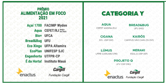Em 2021 e 2022 o Projeto AQUA da Enactus Angra dos Reis foi semifinalista do Edital Alimentação em Foco da empresa Cargill.