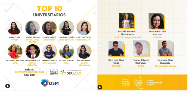 Em 2021 e 2022 a aluna Beatriz Santos foi selecionada entre os top 10 universitários do ano da rede Enactus BR.
