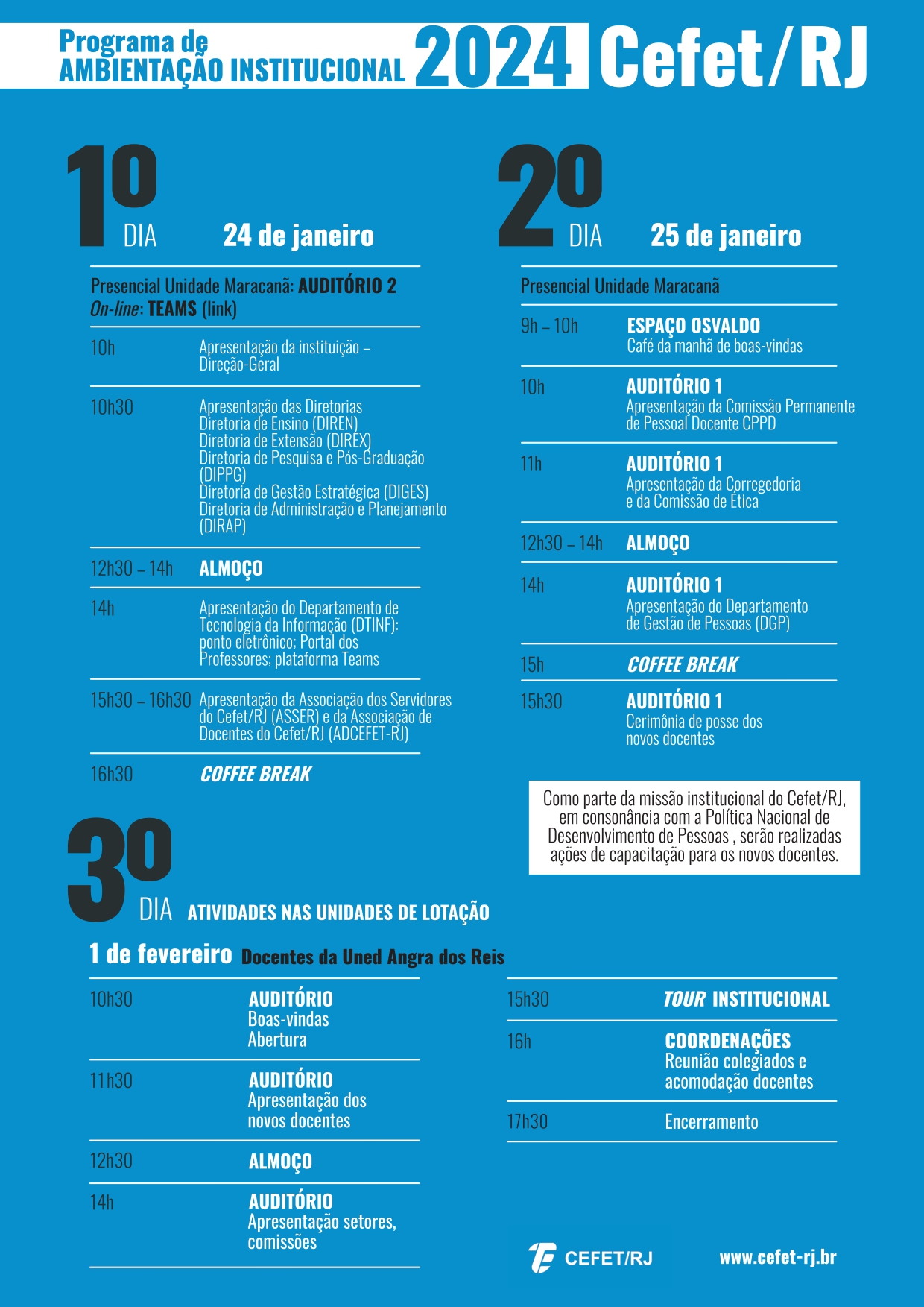 A programação, que será realizada nos dias 24 e 25 de janeiro de 2024, no Cefet/RJ - Maracanã, e no dia 01 de fevereiro de 2024, no campus Angra dos Reis, tem como objetivo a recepção, ambientação e posse dos docentes nomeados através do Edital nº 04/2023.