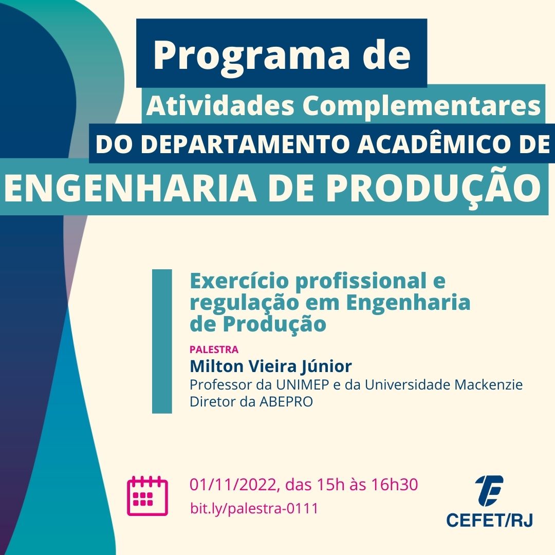 O Programa de Atividades Complementares do Departamento Acadêmico de Engenharia de Produção do Cefet/RJ convida para a palestra “Exercício profissional e regulação em Engenharia...