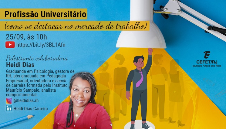 A Gerência Acadêmica do Cefet/RJ campus Angra dos Reis promove, no próximo dia 25 de setembro, a palestra “Profissão Universitário: como se destacar no mercado de trabalho”, ministrada por Heidi Dias. A atividade será transmitida a partir das 10h, pelo canal do campus Angra no YouTube. As inscrições já estão abertas e podem ser realizadas por meio de formulário on-line disponível no Microsoft Forms. Os participantes do encontro terão direito ao certificado.
