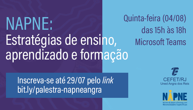 No dia 4 de agosto, o Núcleo de Atendimento às Pessoas com Necessidades Específicas (NAPNE), do Cefet/RJ Uned Angra dos Reis, promoverá a palestra “NAPNE: Estratégias de ensino, aprendizado e formação”. A transmissão será on-line, das 15h às 18h, pela plataforma Microsoft Teams. As inscrições poderão ser realizadas até o dia 29 de julho pelo link bit.ly/palestra-napneangra. Os participantes terão direito a certificado.