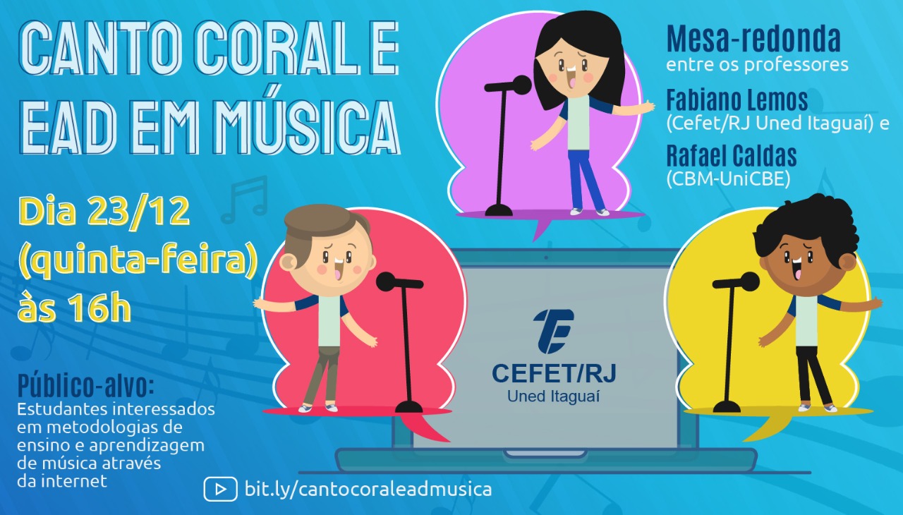 Na próxima quinta-feira (23), às 16h, irá ocorrer a mesa-redonda “Canto coral e EAD em música”. O objetivo é realizar um diálogo sobre processos de ensino e aprendizagem de música a distância. A live terá a participação dos professores Fabiano Lemos, do Cefet/RJ Uned Itaguaí, e Rafael Caldas, do Conservatório Brasileiro de Música – Centro Universitário Brasileiro de Educação (CBM-UniCBE), e será transmitida pelo YouTube.