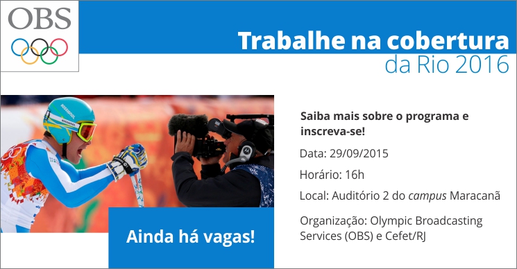 Ainda há vagas para o Programa de Capacitação em Transmissão Televisiva dos Jogos Olímpicos 2016 (BTP), que formará e selecionará profissionais para atuar na Olimpíada. Alunos de cursos técnicos e de graduação, com mais de 18 anos, podem se inscrever. No dia 29 de setembro, representantes da organização OBS estarão no Cefet/RJ novamente para apresentar o programa. Participe!