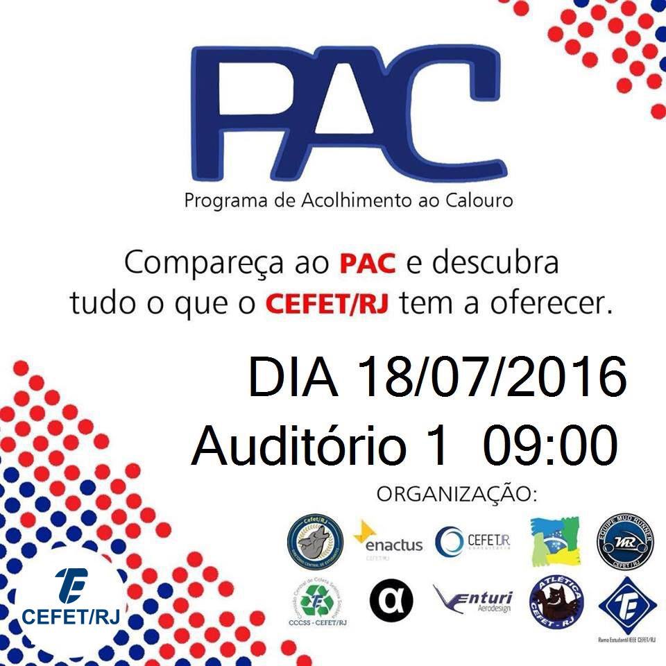 Como em todo primeiro dia de aula do período, o PAC será realizado no Auditório 1 do campus Maracanã, no dia 18/07/2016 às 9h. O evento é uma grande palestra em que todas as extensões dão as boas-vindas aos novos alunos e se apresentam, mostrando tudo que o Cefet/RJ tem a oferecer mesmo fora das salas de aula.