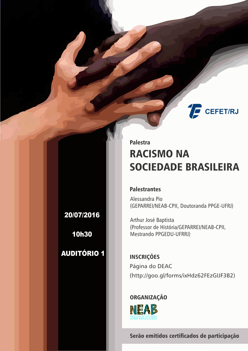 O Núcleo de Estudos Afro-Brasileiros (NEAB) do Cefet/RJ convida toda a comunidade escolar, especialmente os alunos do ensino médio/técnico integrado, para participar da palestra intitulada "Racismo na sociedade brasileira", com a presença dos professores Arthur José Baptista e Alessandra Pio, do NEAB do Colégio Pedro II.