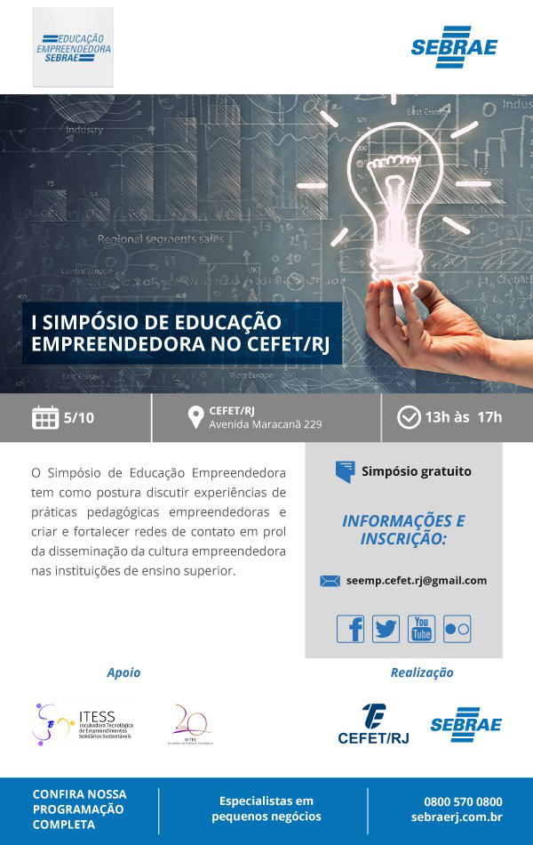 O I Simpósio de Educação Empreendedora do Cefet/RJ acontecerá no dia 5 de outubro de 2016, no Auditório 2 do campus Maracanã. O evento é realizado pela Diretoria de Extensão, através de suas incubadoras, em parceria com o Sebrae, e destina-se a servidores da ativa do Cefet/RJ (de todos os campi) e alunos desta instituição ligados ao protagonismo estudantil que desenvolvem ou pretendem desenvolver atividades relacionadas ao empreendedorismo. Inscrições gratuitas por e-mail.