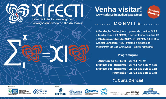 A Diretoria de Extensão, por meio do Departamento de Extensão e Assuntos Comunitários (DEAC), convida a todos para a XI FECTI (Feira Estadual de Ciência, Tecnologia e Inovação), organizada pela Fundação CECIERJ, que será realizada no sábado e no domingo (25/11 e 26/11) no pátio azul do Cefet/RJ campus Maracanã.