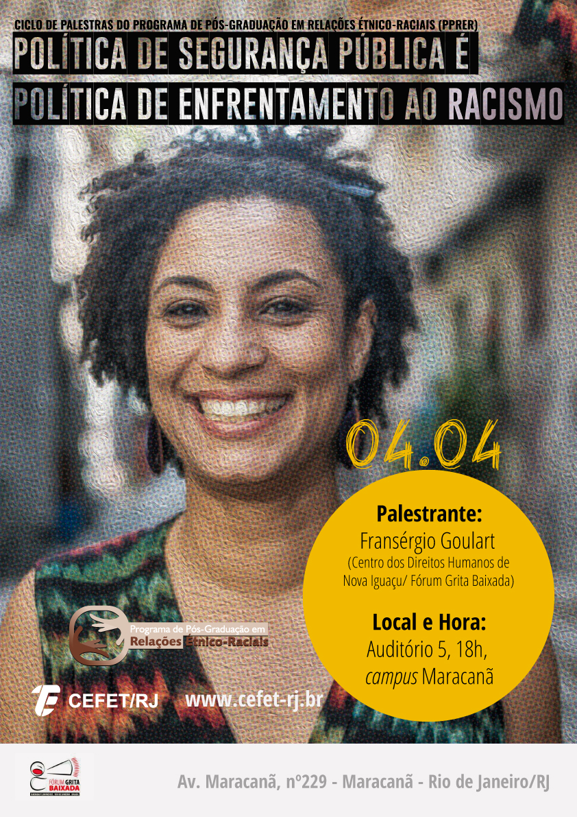 O Ciclo de Palestras do PPRER, em seu segundo encontro, recebe Fransérgio Goulart, assessor político do Centro de Direitos Humanos de Nova Iguaçu (CDHNI), e traz a temática "Política de segurança pública é política de enfrentamento ao racismo". A palestra será no dia 4 de abril, às 18h, no Auditório 5 do campus Maracanã, e contará com a parceria do Fórum Grita Baixada. O palestrante abordará a questão da segurança pública e o dever do governo de oferecê-la de forma igualitária e acessível para todos os cidadãos.