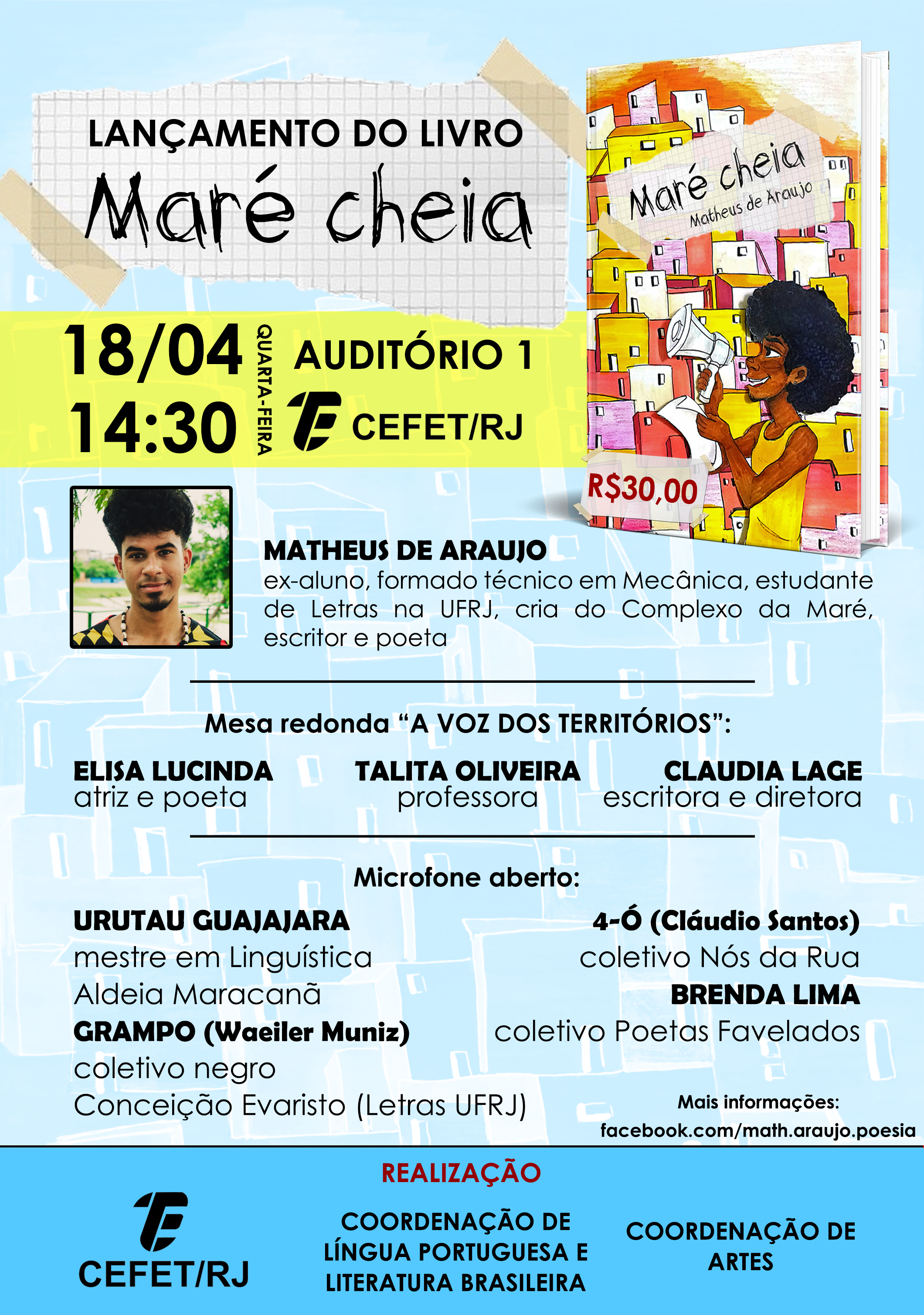 A Coordenação de Artes e a Coordenação de Língua Portuguesa e Literatura Brasileira convidam para o lançamento do livro "Maré Cheia", de Matheus de Araújo, no dia 18 de abril, às 14h, no Auditório 1 do campus Maracanã.