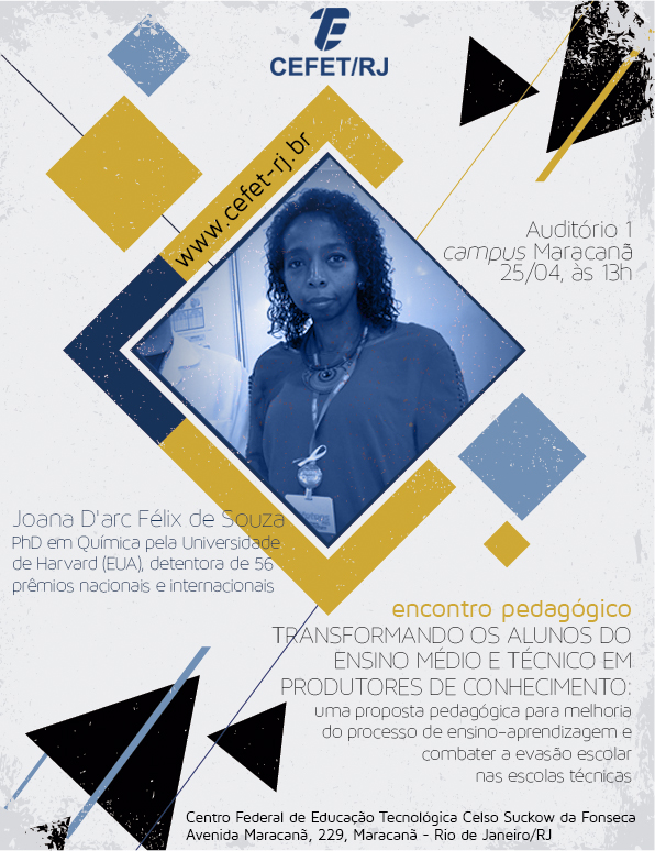 O Departamento de Ensino Médio e Técnico (DEMET) convida a comunidade escolar para o encontro pedagógico, no dia 25/04, no Auditório 1, às 13h, com a Prof.ª Dra. Joana D'Arc Felix de Souza, PhD em Química pela Universidade de Harvard (EUA), com o tema: "Transformando os alunos do ensino profissional técnico de nível médio em produtores de conhecimento: uma proposta para melhoria do processo de ensino e aprendizagem e combate à evasão escolar nas escolas técnicas". A professora Joana D'Arc é uma mulher negra brasileira, oriunda de uma família pobre, que entrou na universidade aos 13 anos e aos 22 anos concluiu seu doutorado. Sua carreira é marcada por um grande sucesso como cientista e docente, tendo acumulado 56 prêmios internacionais e nacionais e sendo eleita, em 2014, a Pesquisadora do Ano no Kurt Politzer de Tecnologia. Sua palestra será sobre o processo pedagógico que pôs em prática numa escola técnica da cidade de Franca (SP), unindo os conhecimentos científicos trabalhados na sala de aula e sua aplicação prática na criação de determinados produtos, com o objetivo de desenvolver a criatividade, o conhecimento e o gosto pelo estudo nos alunos do ensino profissional técnico de nível médio. Além disso, a história pessoal da professora Joana D'Arc é um ensinamento para a vida e sobre o combate ao preconceito e à descriminação racial no nosso país.