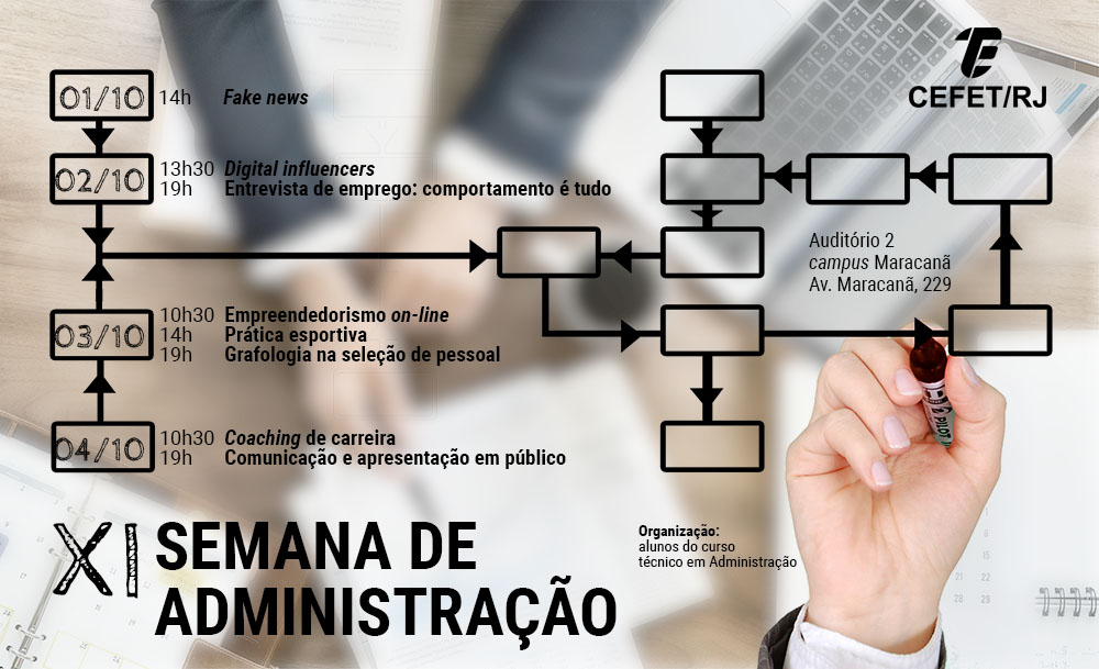 A XI Semana de Administração ocorrerá entre os dias 1º e 4 de outubro, no Auditório 2 do campus Maracanã. O evento é organizado pelos alunos do curso técnico em Administração.