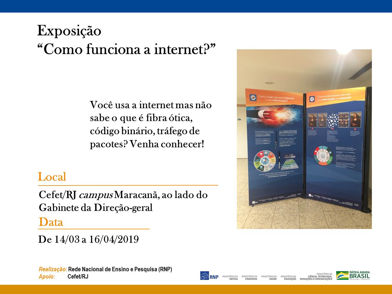 A partir do dia 26 de março, às 10h15, a equipe do Departamento de Tecnologia da Informação (DTINF) fará a mediação da exposição "Como funciona a internet?", montada no campus Maracanã, ao lado do Gabinete da Direção-geral. As visitas guiadas ocorrerão todas as terças-feiras, no mesmo horário.