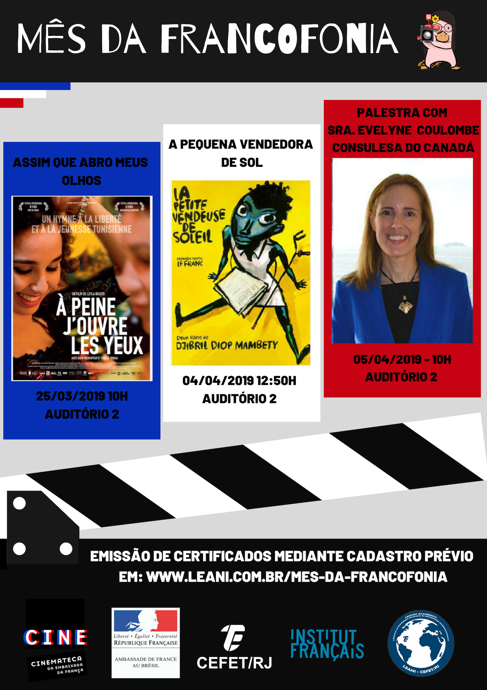 Por ocasião do Mês da Francofonia, a equipe de Língua Francesa do LEANI preparou uma agenda com dois filmes, um curta e um longa, além de uma palestra. Cada filme será seguido de um debate que tem como objetivo pensar novas ideias em prol dos direitos das mulheres, visto que o tema mundial do Mês da Francofonia em 2019 é "Mulheres e identidades francófonas".
